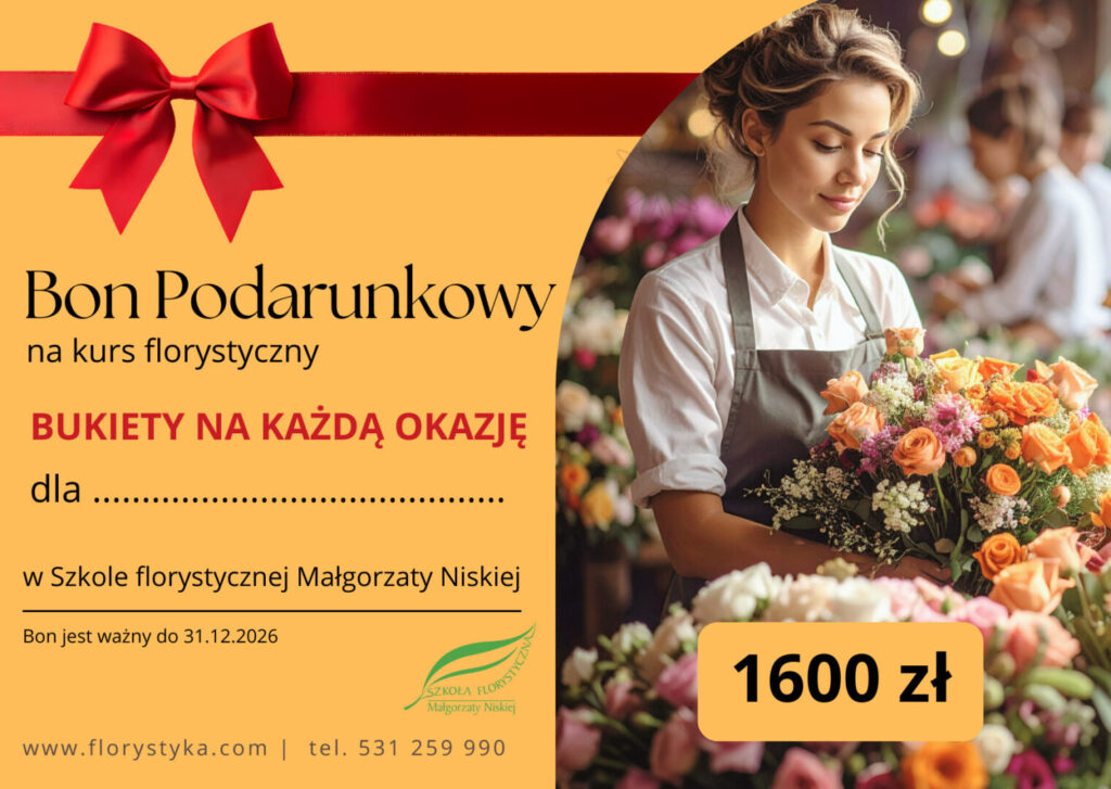 Podaruj jej bon upominkowy o dowolnie wybranej wartości na kurs florystyczny w naszej szkole!